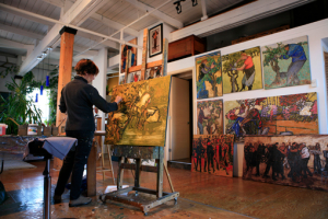 Spring reanimates colour. Yellows, acid greens, bright pinks strive against shivery blues. Travel related themes emerge. The artist explores light from warm and sunny countries, depicting African women, Vietnamese pirogues, and laborers in fields or rice plantations.