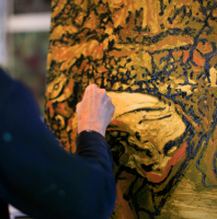 The plastic art of Vézina features generous textures created by the abundant use of material, allowing the artist to literally fragment paste. This dimension confers a tactile facet to her work, as she marks her canvas with irregular patterns flowing through the entire surface. The subject appears to be emerging from magma, engendering a fusion between form and matter.